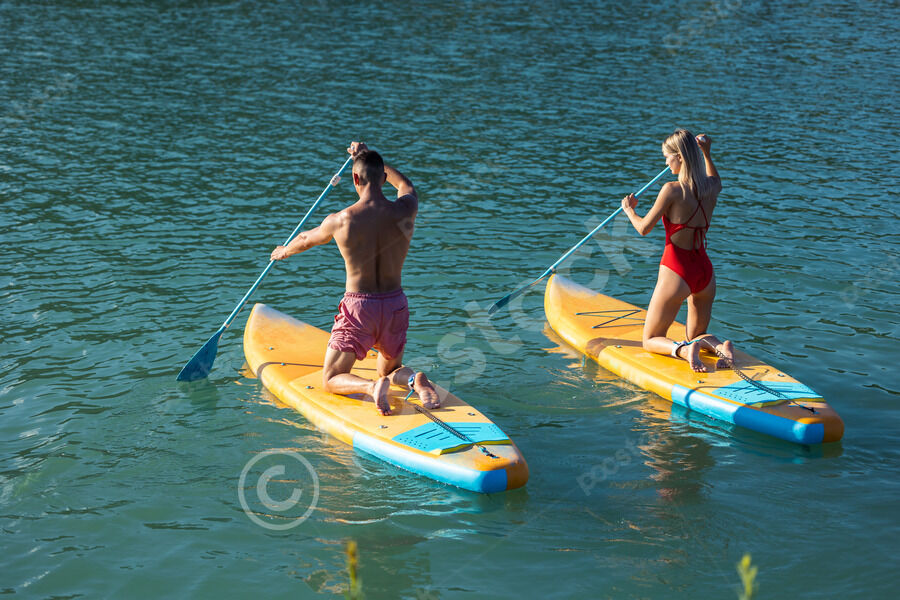 Hispanic man and caucasian woman paddling on beach while kneeling on paddle board during summer