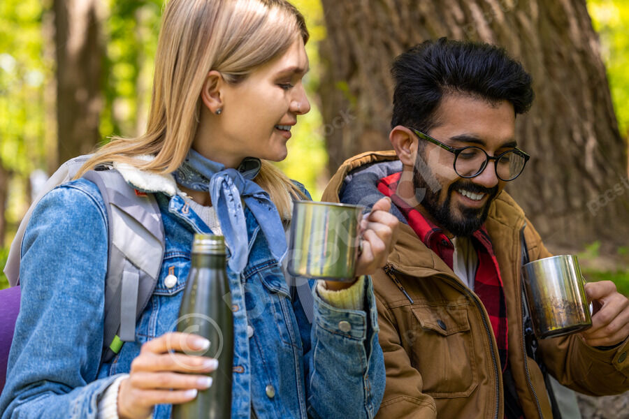 Black father and caucasian wife sitting together with their pre-teen kids in park