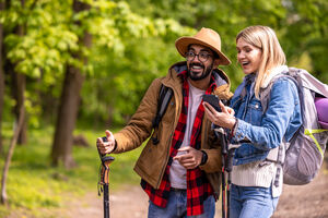 Black pre-teen siblings with backpacks holding hands while walking together in park