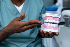 Cropped image of Black male dentist showing human tooth anatomy with emphasis on root in clinic