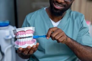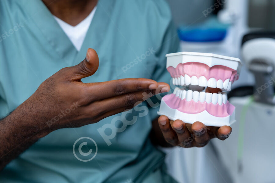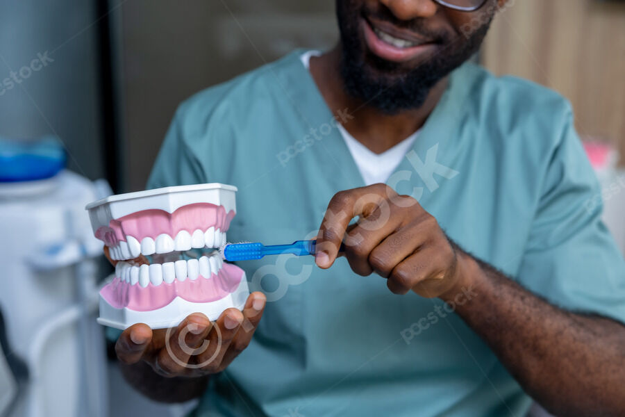 Cropped image of Black male dentist showing how to brush teeth properly using dental dentures while sitting in clinic