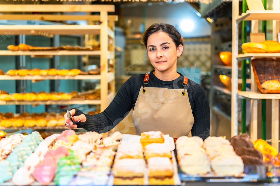 Hispanic female baker in apron using touchscreen computer to calculate the bill of customer while standing at counter in bakery