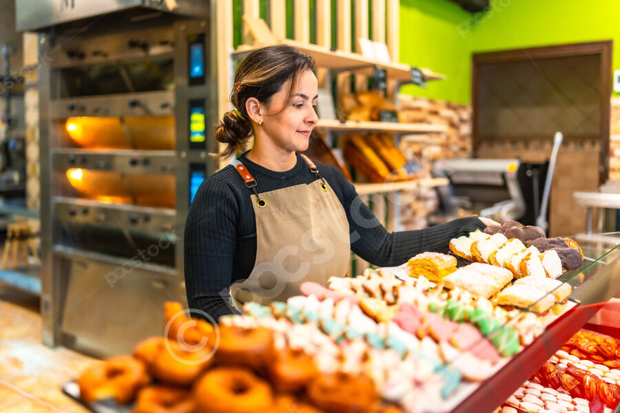 Hispanic female baker in apron using tong in arranging colorful breads at counter display in bakery