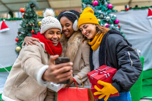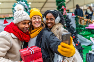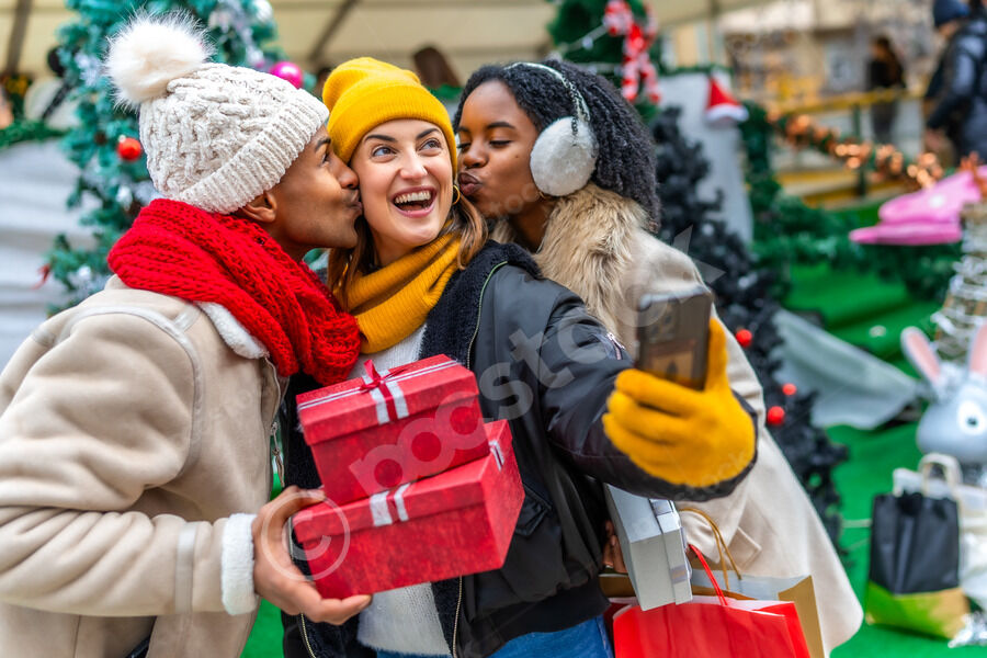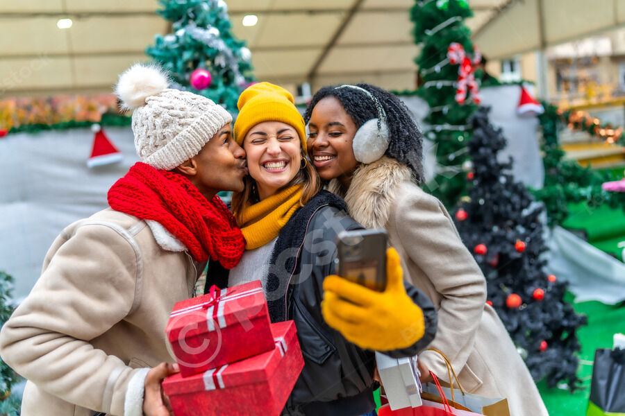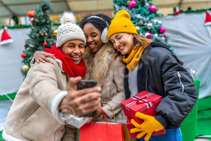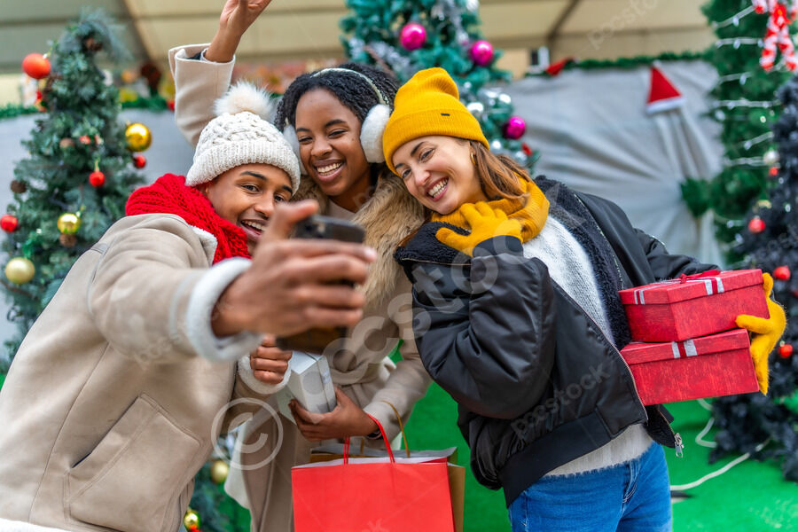 Diverse group of friends in warm clothing having fun holding gifts and taking selfie on smartphone while standing close together at Christmas market