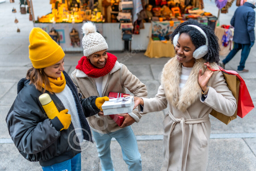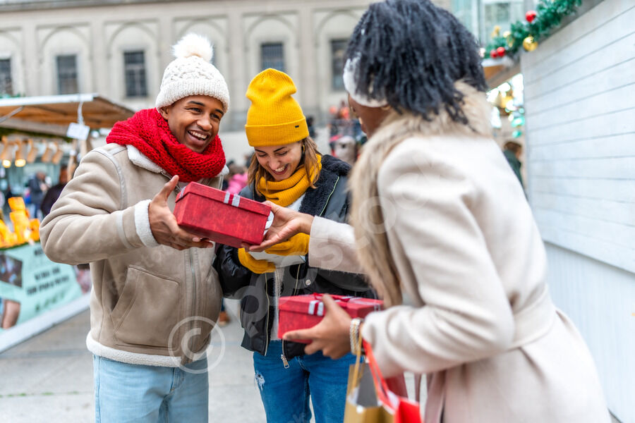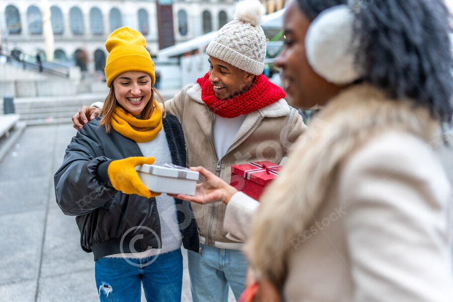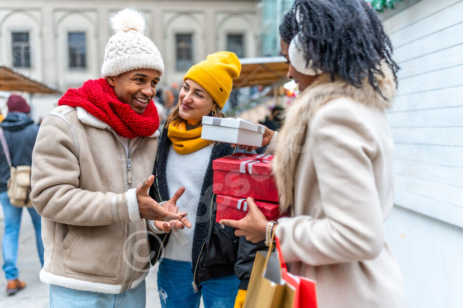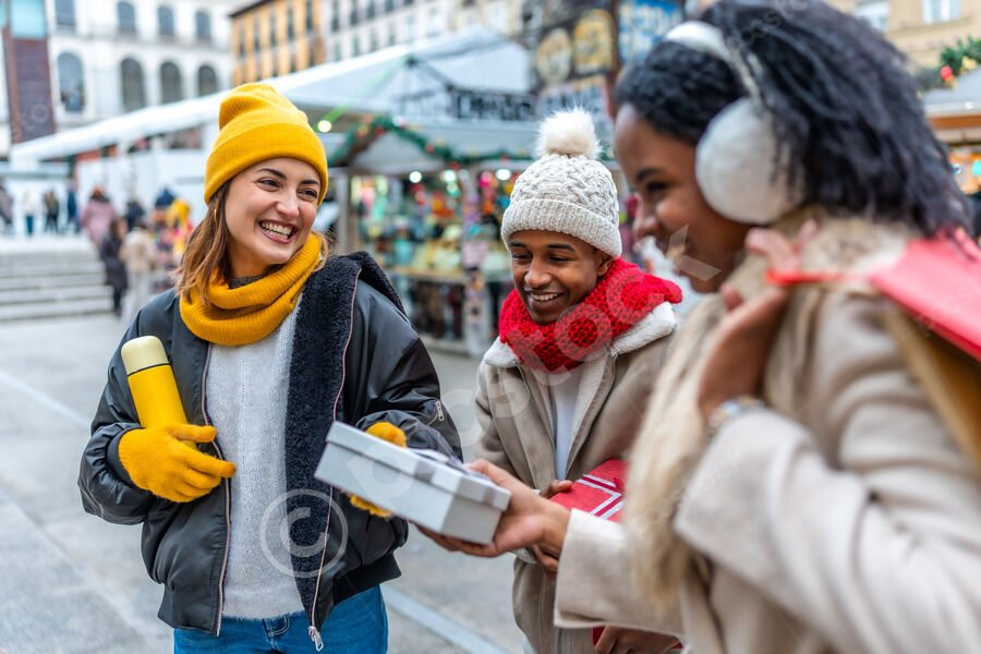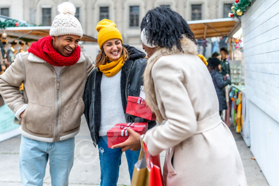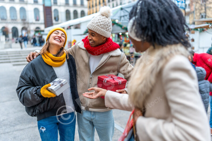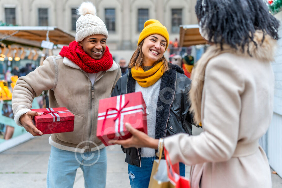 Diverse group of friends in warm clothing having fun exchanging gifts while standing in Christmas market during winter holidays