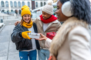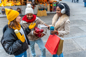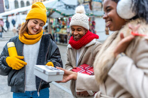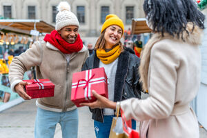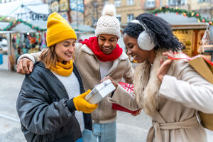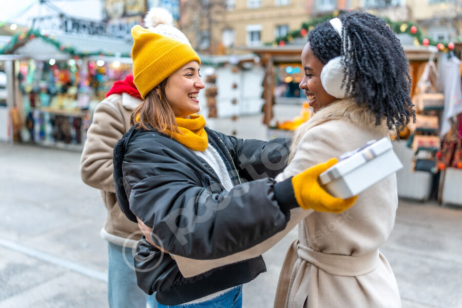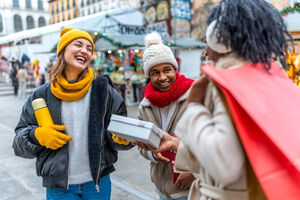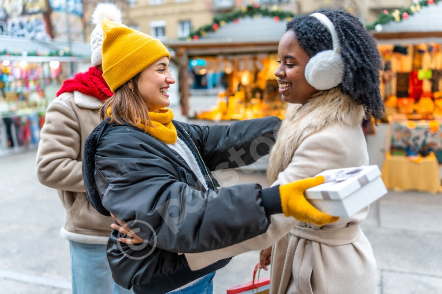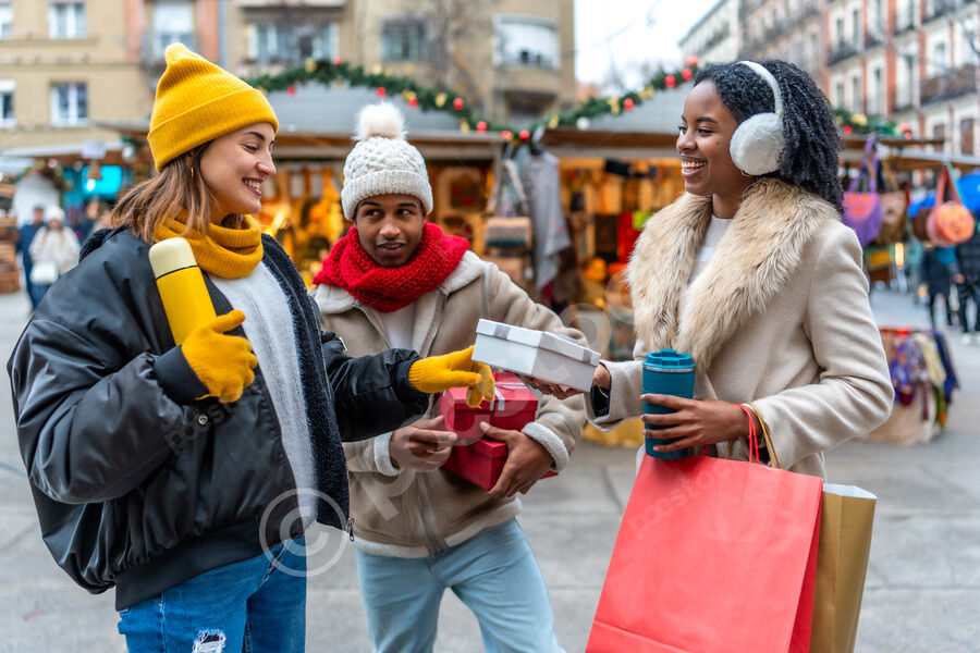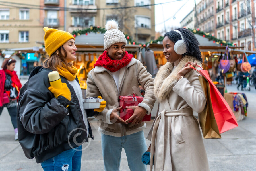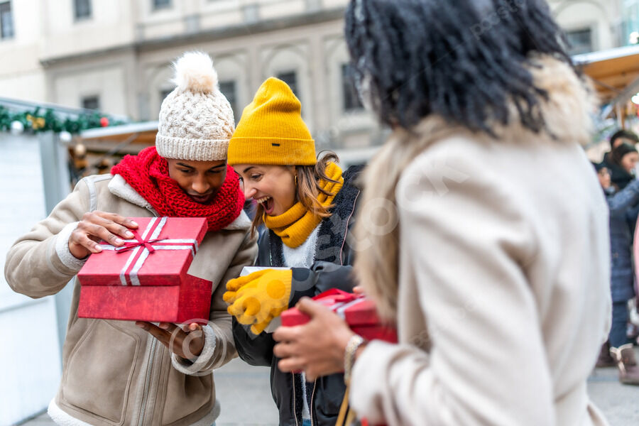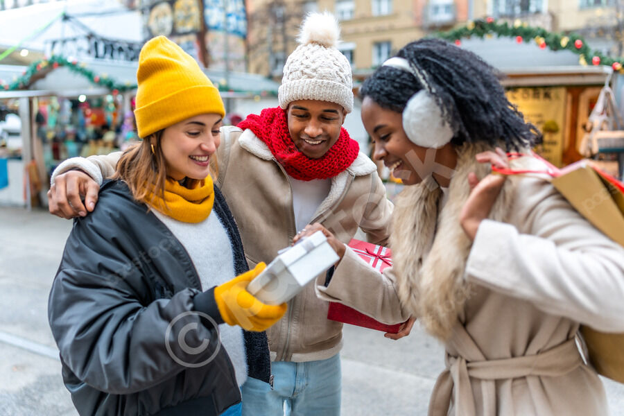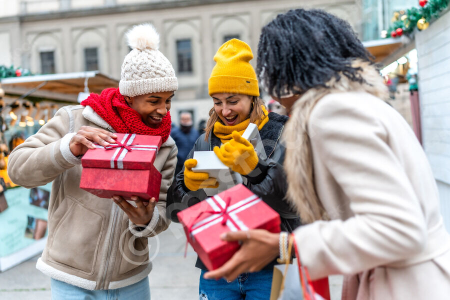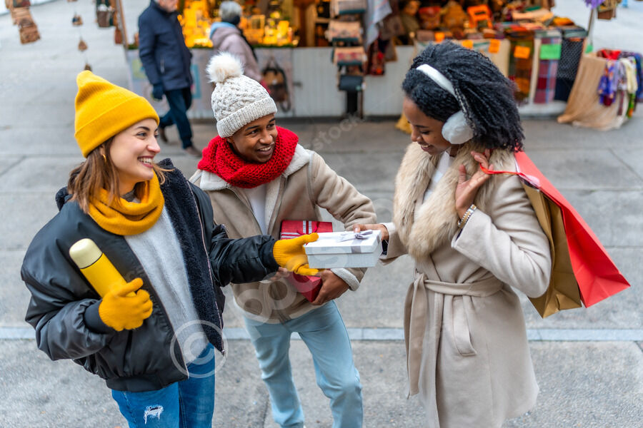 Diverse group of friends in warm clothing having fun exchanging gifts while standing in Christmas market during winter holidays