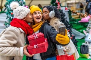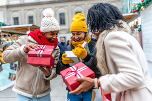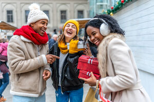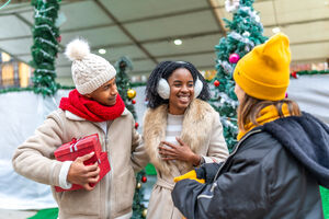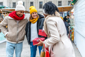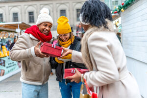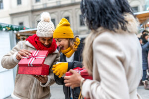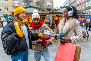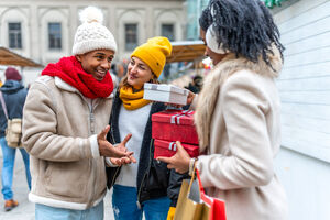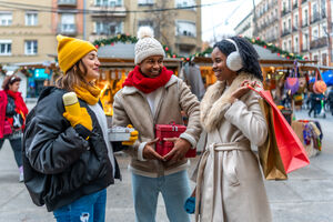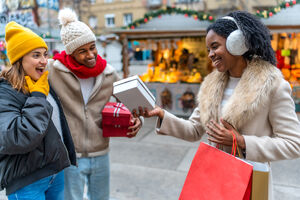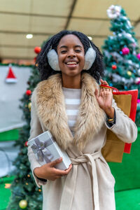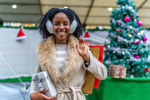 Black woman in warm clothing holding gift box and shopping bags over her shoulder smiling while standing at Christmas market
