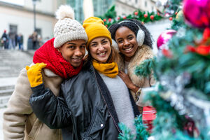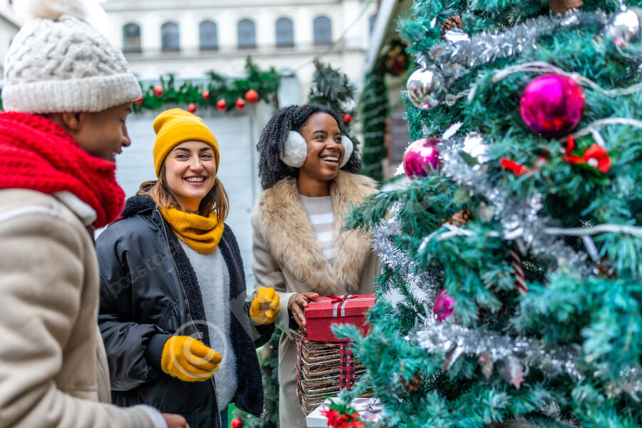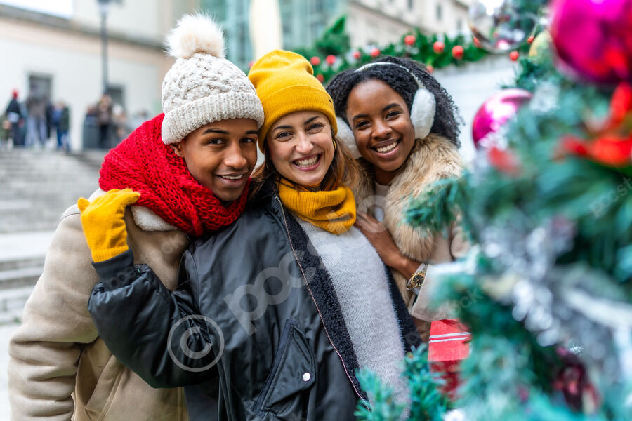 Diverse group of friends in warm clothing smiling while standing together near Christmas tree in city during winter holidays