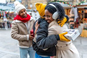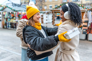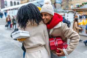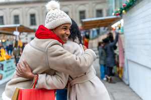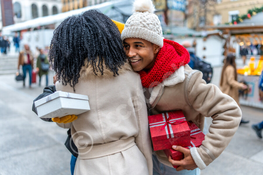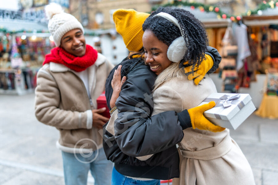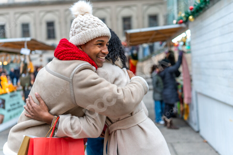 Black male and female friends in winter clothing hugging and greeting each other in Christmas market during winter holidays