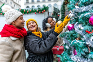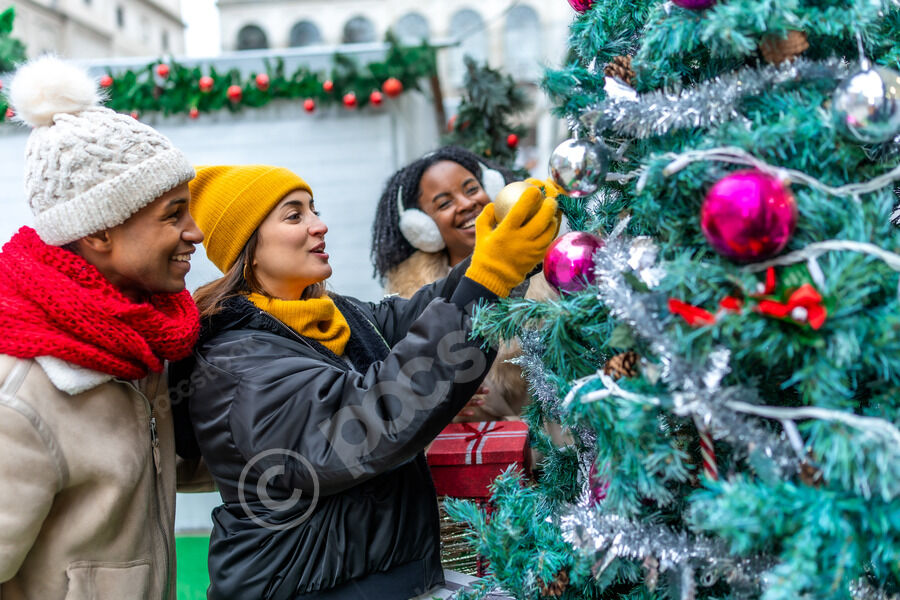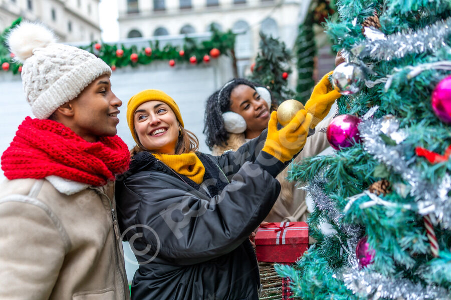 Diverse group of friends in warm clothing admiring decorations on Christmas tree while standing together in city during winter holidays
