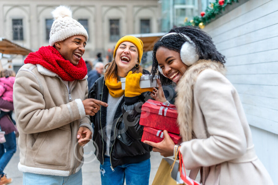 Diverse group of friends in warm clothing having fun holding gifts and talking while standing together at Christmas market