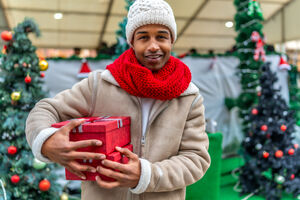 Black man in warm clothing holding gift box and smiling while standing at Christmas market