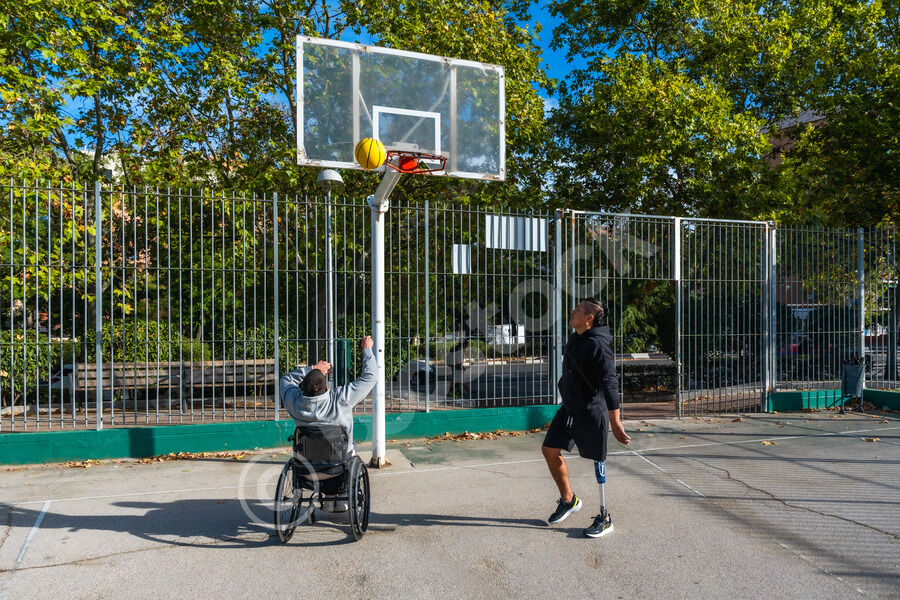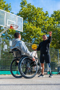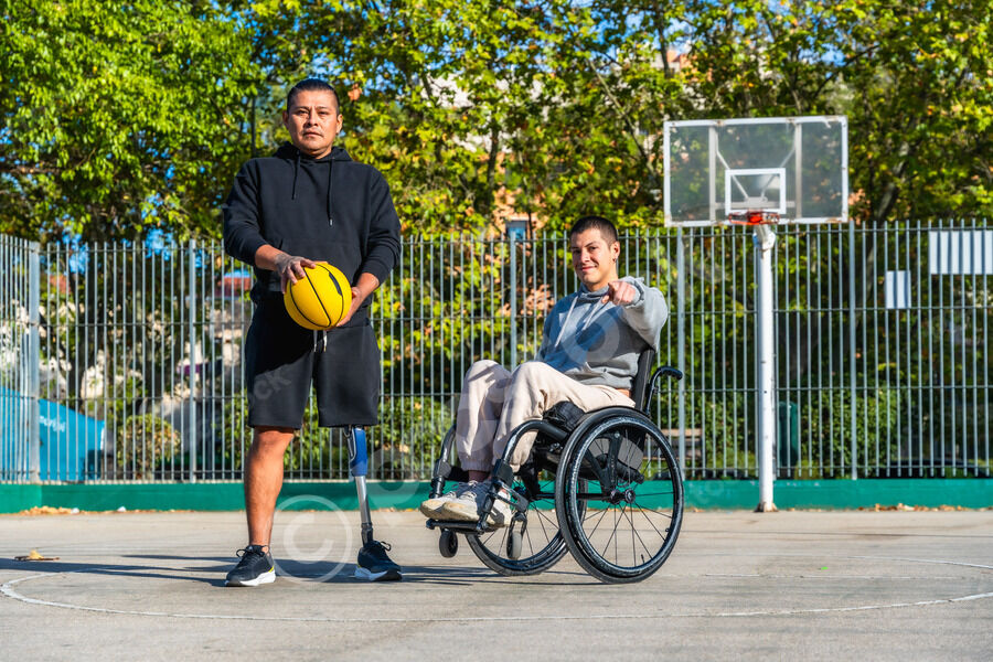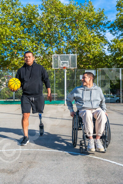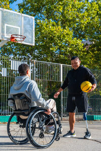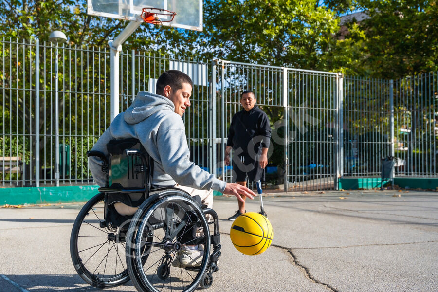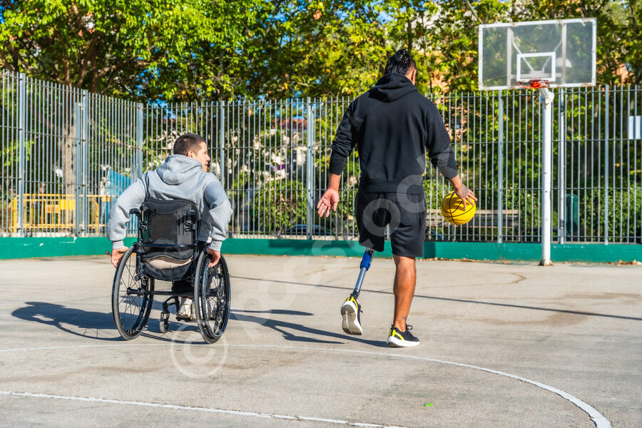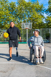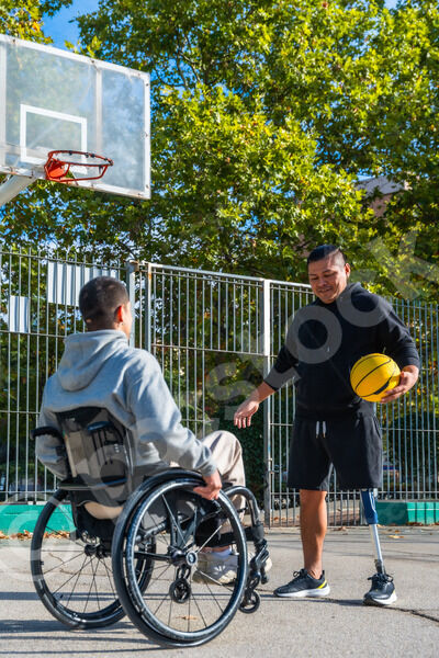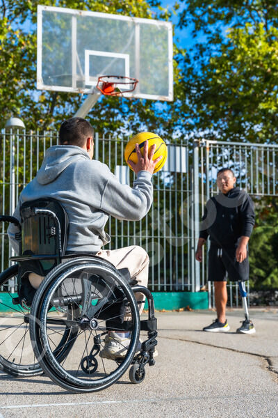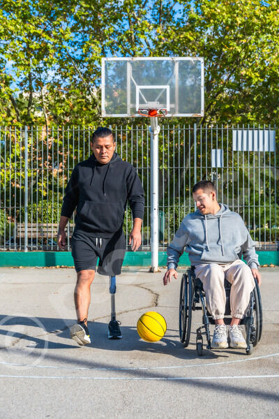 Disabled Hispanic man with prosthetic leg playing basketball with caucasian male friend sitting in wheelchair on outdoor basketball court on sunny day