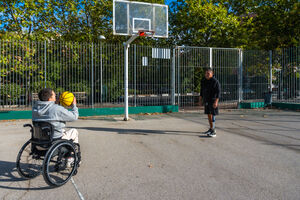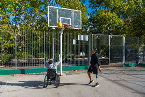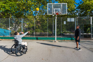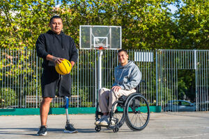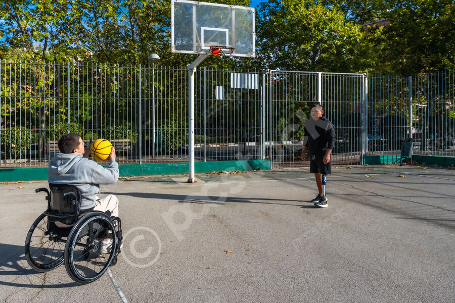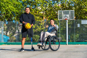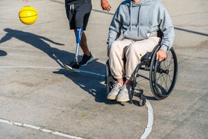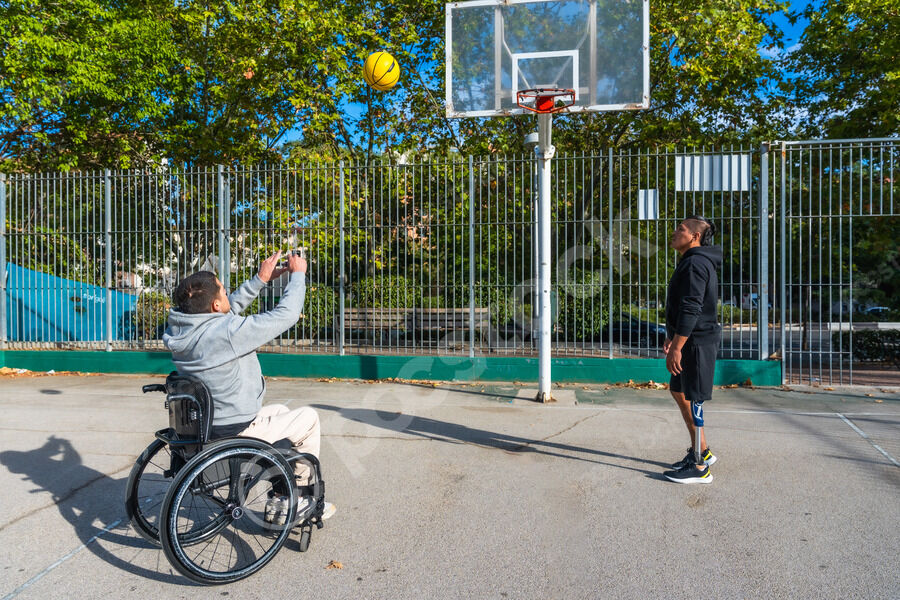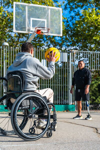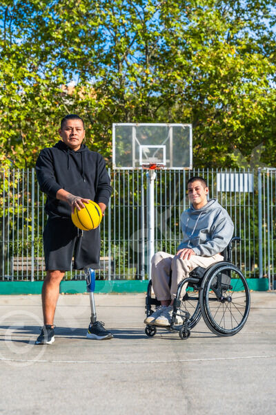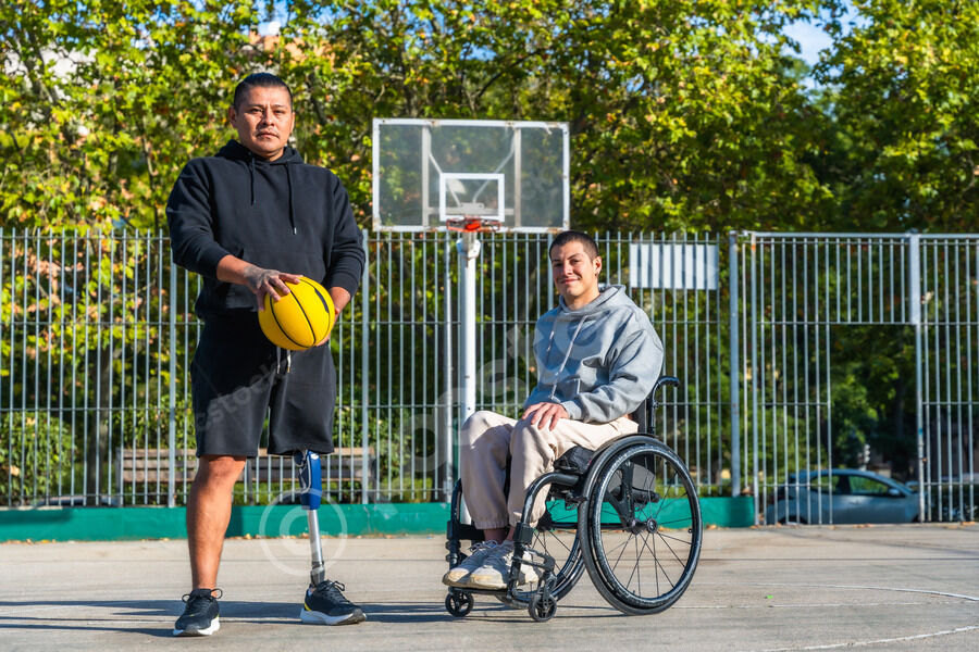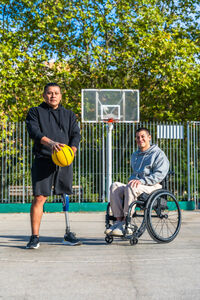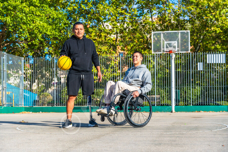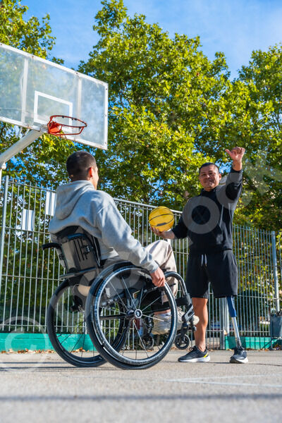 Disabled Hispanic man with prosthetic leg playing basketball with caucasian male friend sitting in wheelchair on outdoor basketball court on sunny day