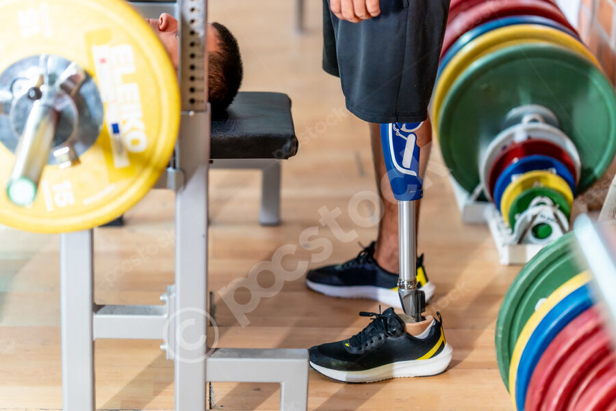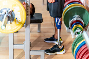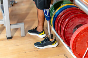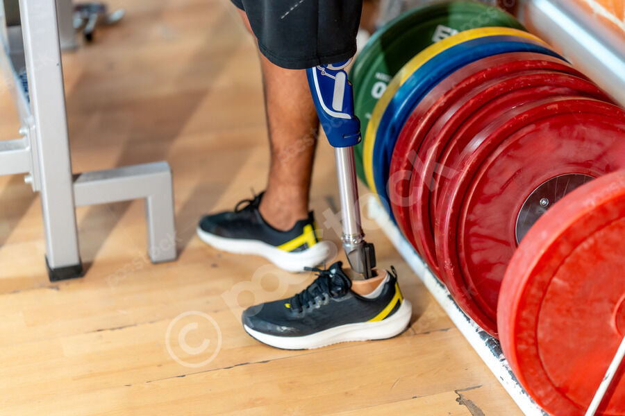 Cropped image of disabled Hispanic man with prosthetic leg standing in gym