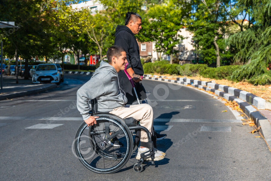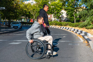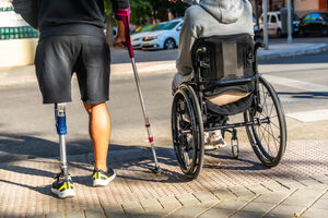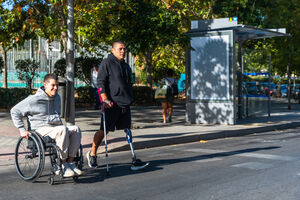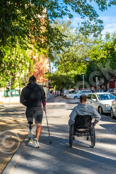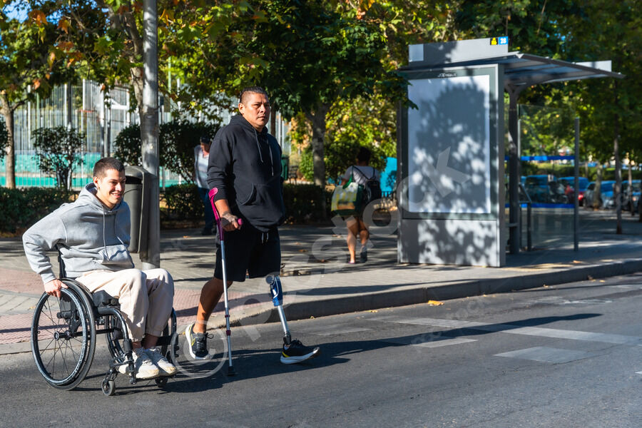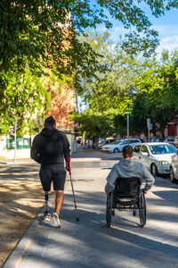Disabled Hispanic man with prosthetic leg and crutch moving with caucasian male friend sitting in wheelchair on city street during daytime