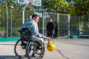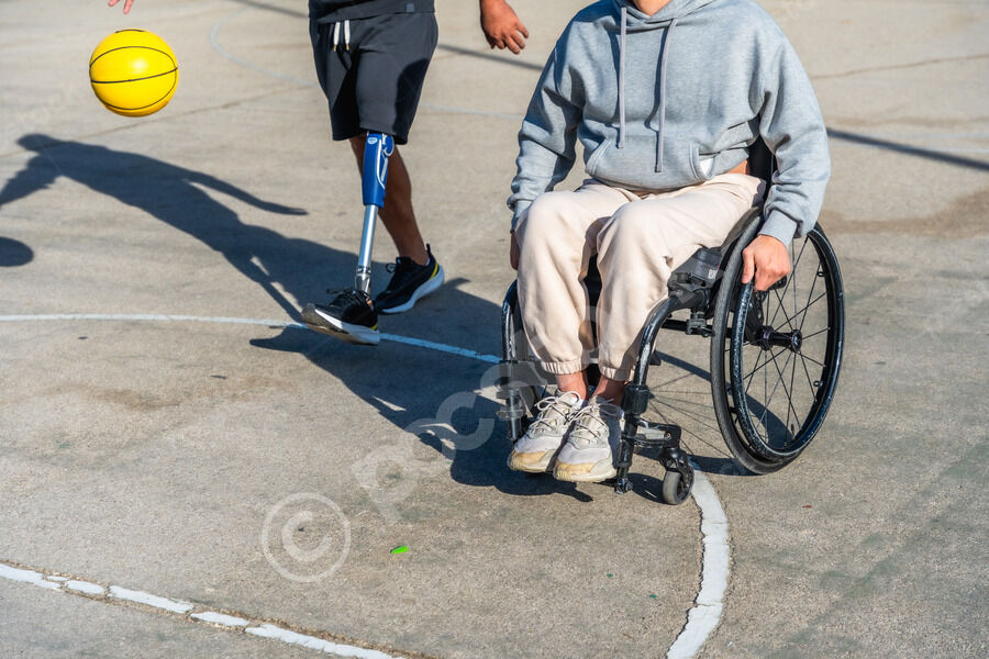 Cropped image of disabled Hispanic man with prosthetic leg playing basketball with caucasian male friend sitting in wheelchair on outdoor basketball court on sunny day