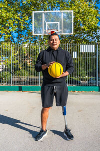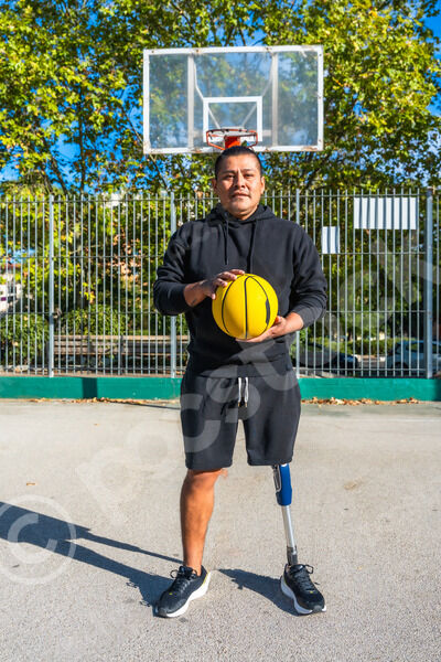 Disabled Hispanic man in black hoodie and prosthetic leg holding yellow basketball standing on an outdoor court on sunny day