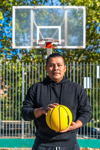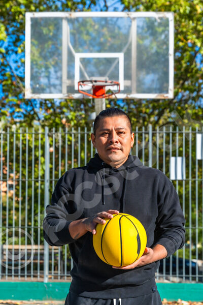 Hispanic man in black hoodie holding yellow basketball standing on an outdoor court on sunny day