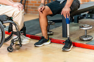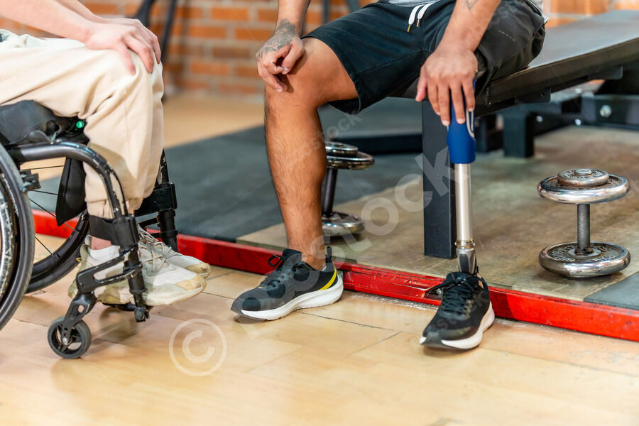Cropped image of disabled Hispanic and caucasian men sitting on bench and wheelchair in gym