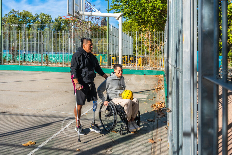 Disabled Hispanic man with prosthetic leg and crutch playing basketball with caucasian male friend sitting in wheelchair on outdoor basketball court on sunny day