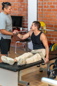 Disabled Hispanic man giving manly handshake with caucasian male friend sitting on bench in gym