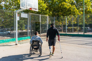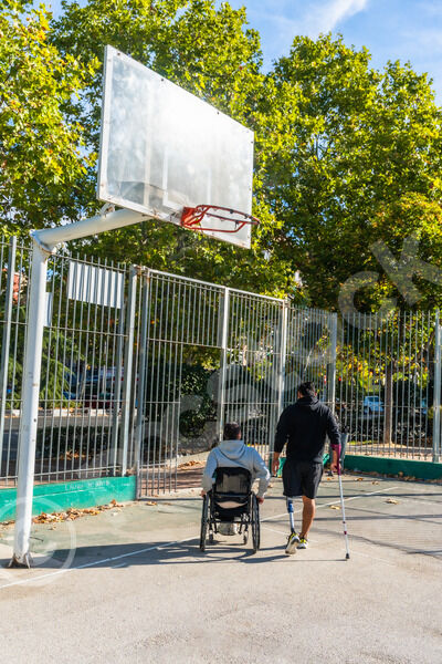 Disabled Hispanic man with prosthetic leg and crutch moving with caucasian male friend sitting in wheelchair on outdoor basketball court on sunny day