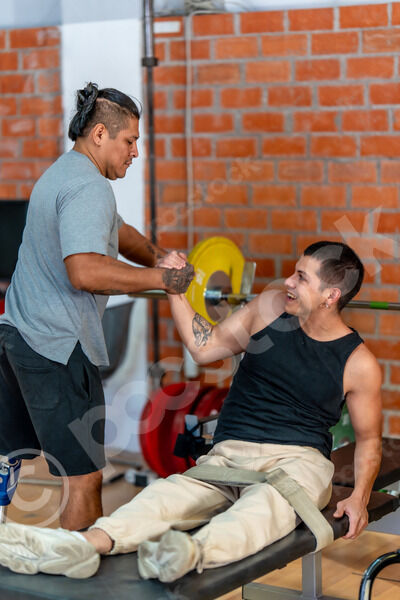 Cropped image of disabled Hispanic man with prosthetic leg assisting caucasian male friend lying on bench and lifting weights in gym