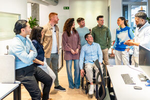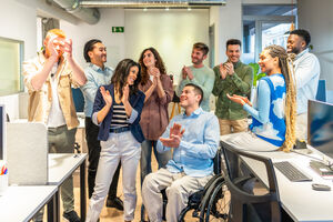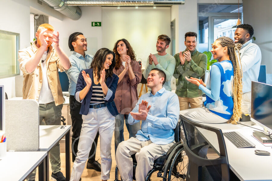 Diverse business team clapping and celebrating success in modern office with disabled colleague