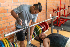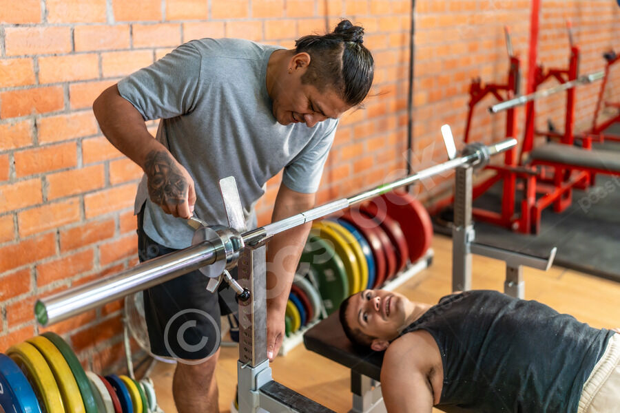 Disabled Hispanic man with prosthetic leg assisting caucasian male friend lying on bench and lifting weights in gym