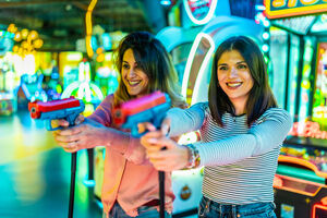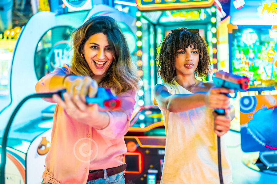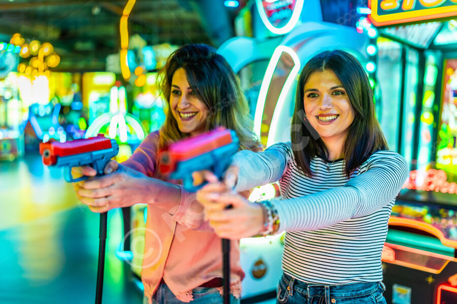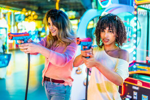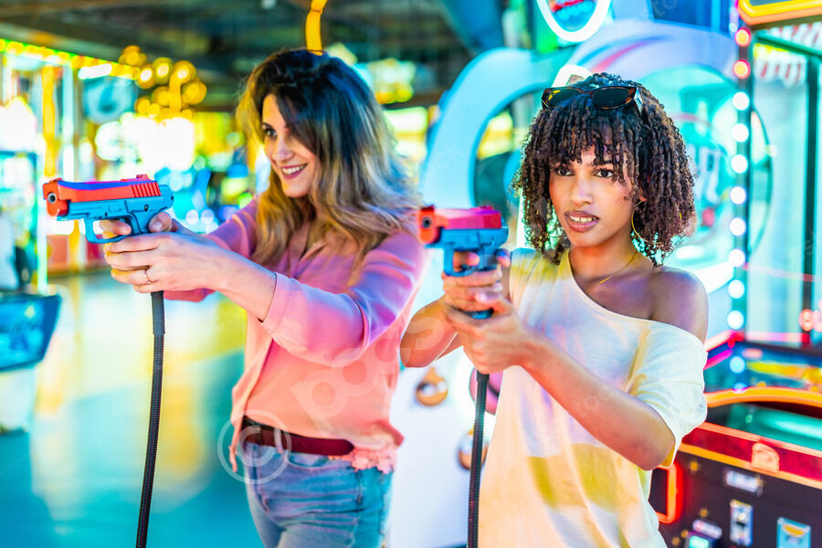 Mixed-race and caucasian female friends having fun playing with toy guns in an amusement arcade