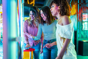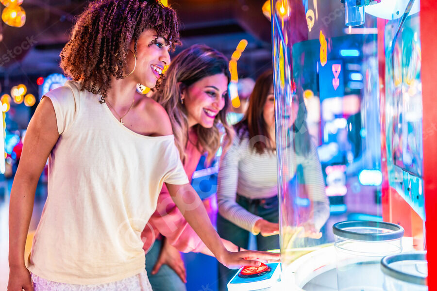 Diverse group of female friends playing arcade games having fun together in an entertainment center