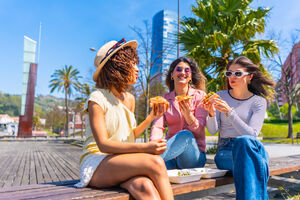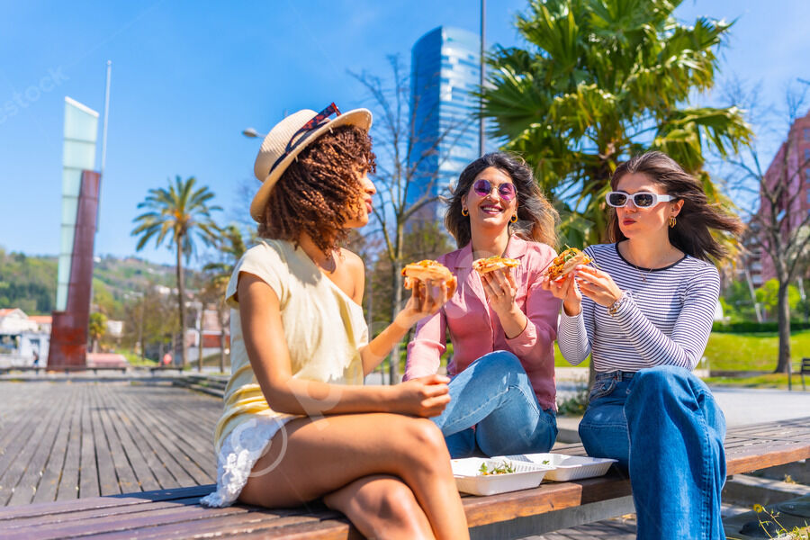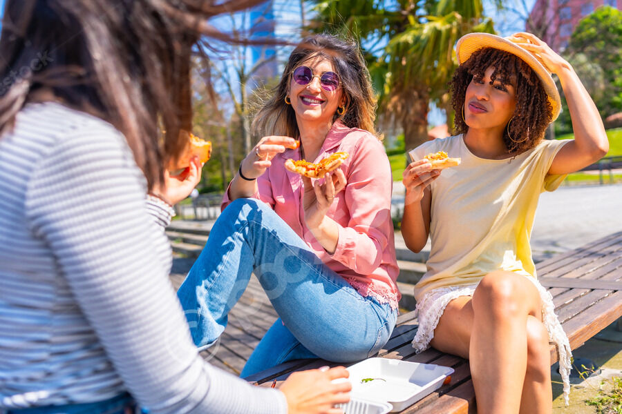 Diverse group of female friends having fun eating pizza and talking while sitting together on wooden bench in city park on sunny day
