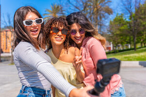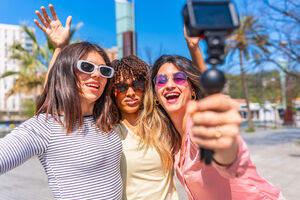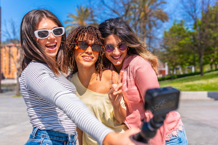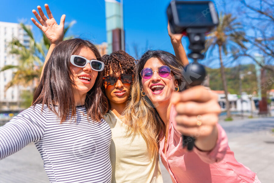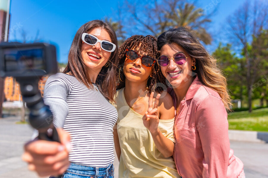 Diverse group of female friends wearing sunglasses taking selfie using action camera while standing together in city on sunny day