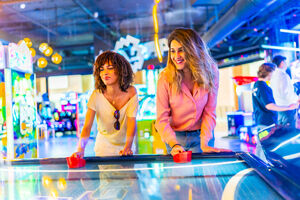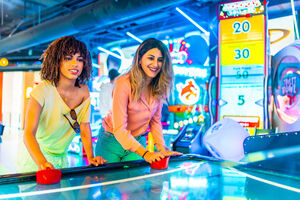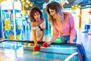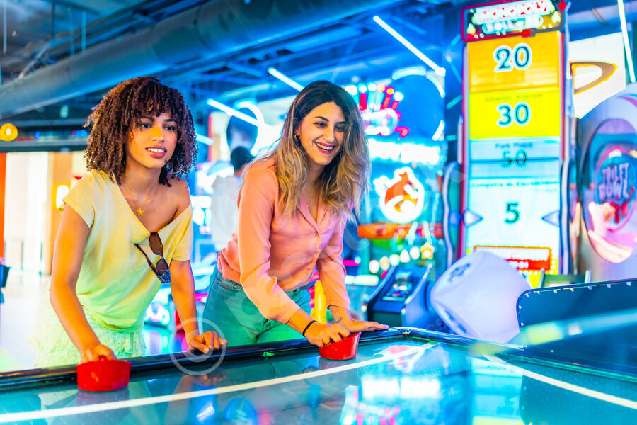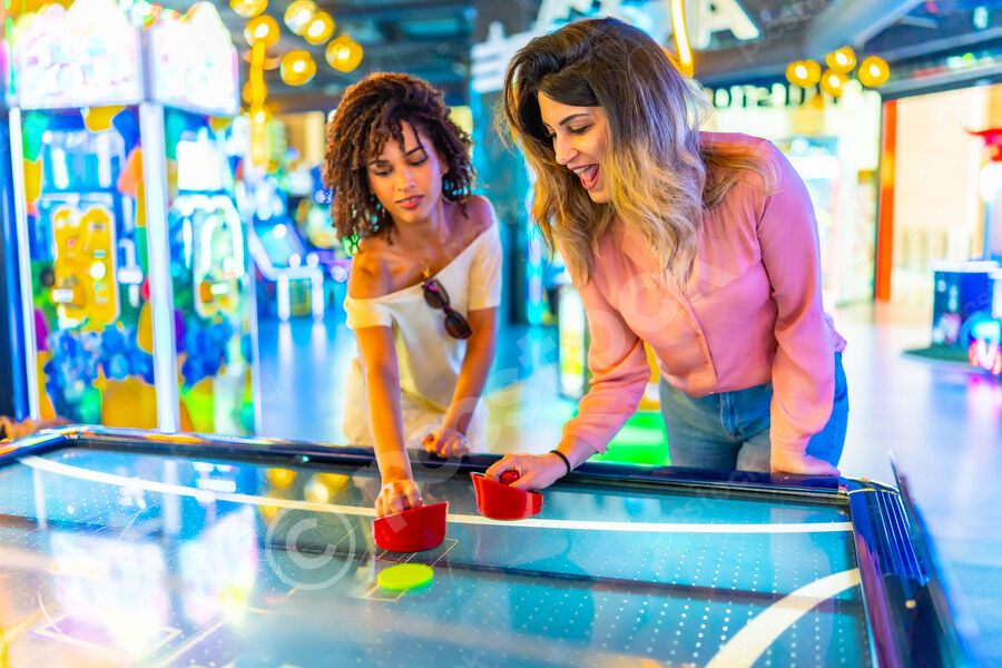 Mixed-race and caucasian female friends having fun playing air hockey in an amusement arcade