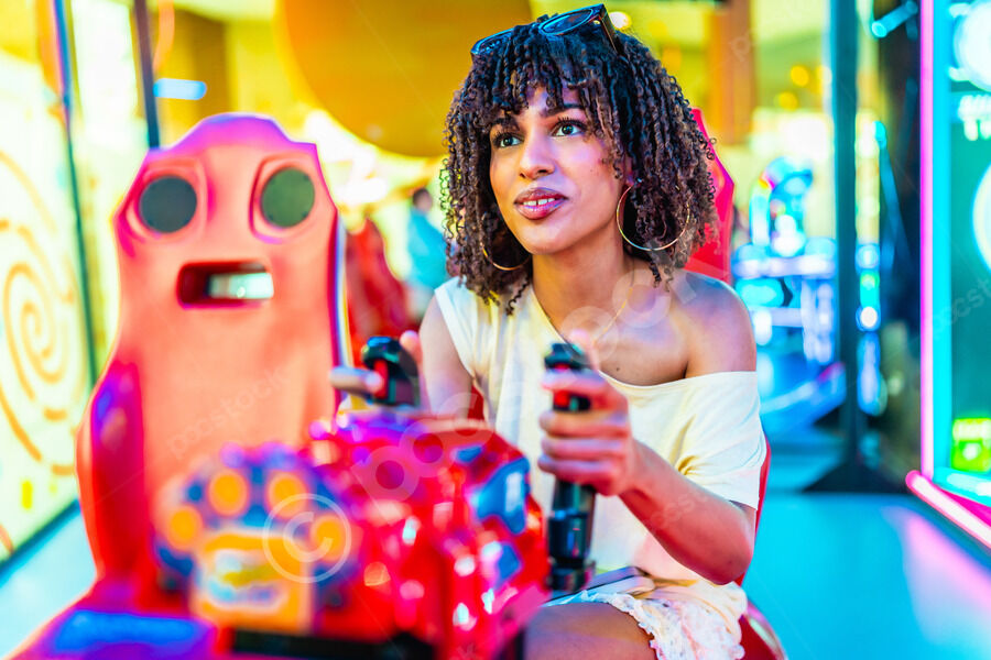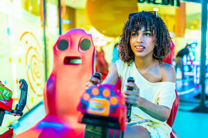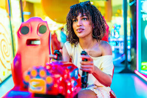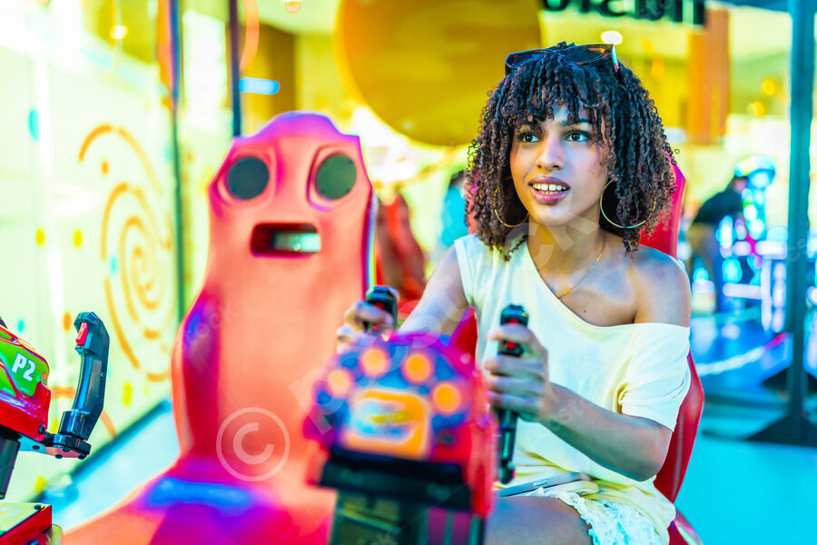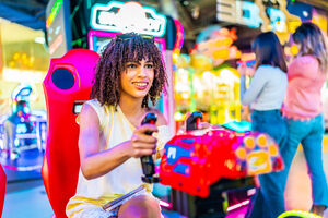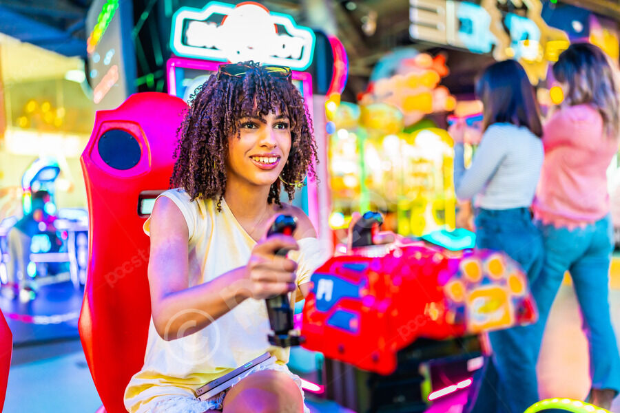 Mixed-race female teenager with curly hair playing arcade racing game in an entertainment center