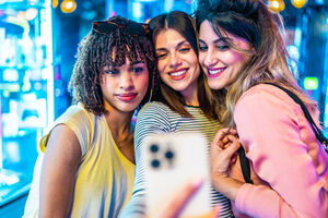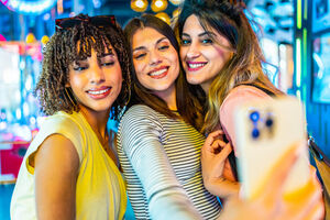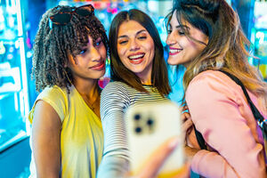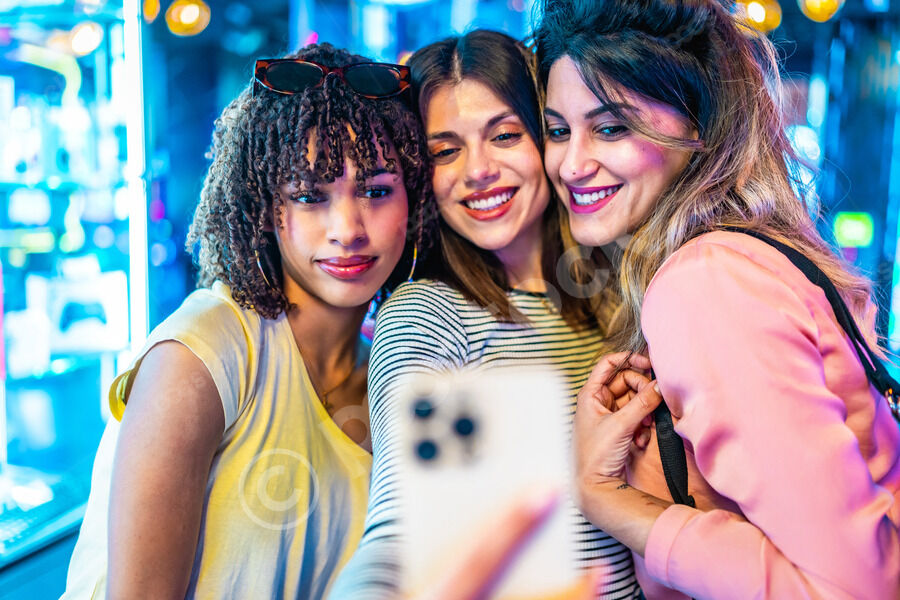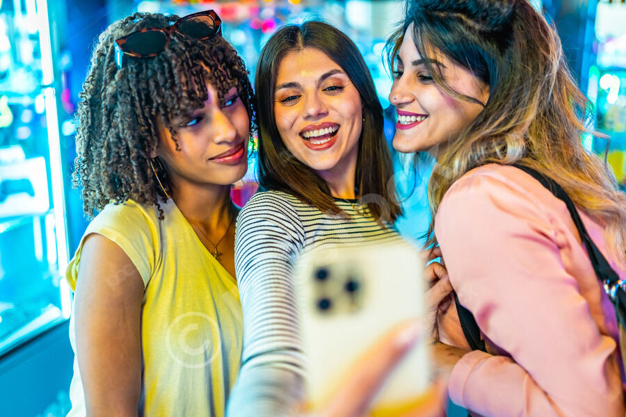 Diverse group of female friends taking selfie on smartphone while standing close together in an amusement arcade