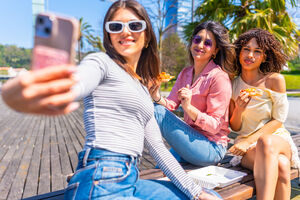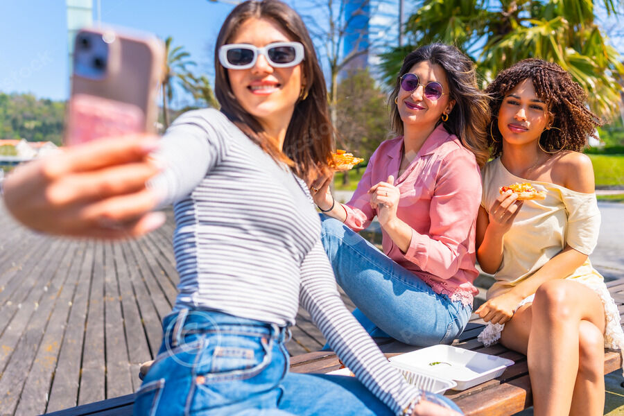 Diverse group of female friends eating pizza and taking selfie on smartphone while sitting together on wooden bench in city park on sunny day