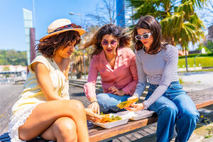 Diverse group of female friends enjoying takeaway food while sitting together on wooden bench in city park on sunny day