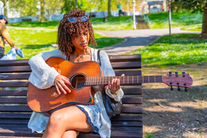 Mixed-race female teenager with curly hair playing acoustic guitar while sitting on wooden bench in park on sunny day