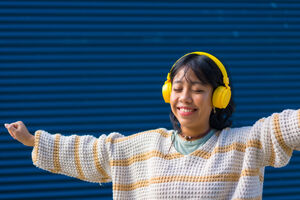 Smiling Asian female with closed eyes spreading arms listening to music with headphones standing against blue metal wall outdoors during daytime