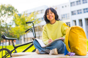 Smiling Asian female student with notepad sitting with crossed legs on bench near bike in university