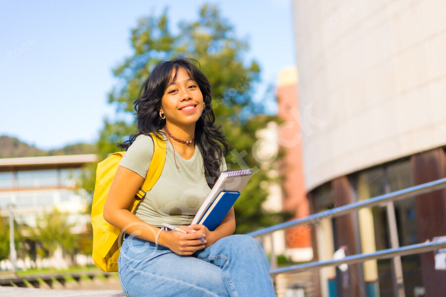 Smiling Asian female student with backpack holding books sitting with crosed legs on bench in university during daytime