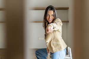 Hispanic woman with curly afro tossing hair standing in front of wall during daytime