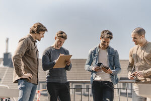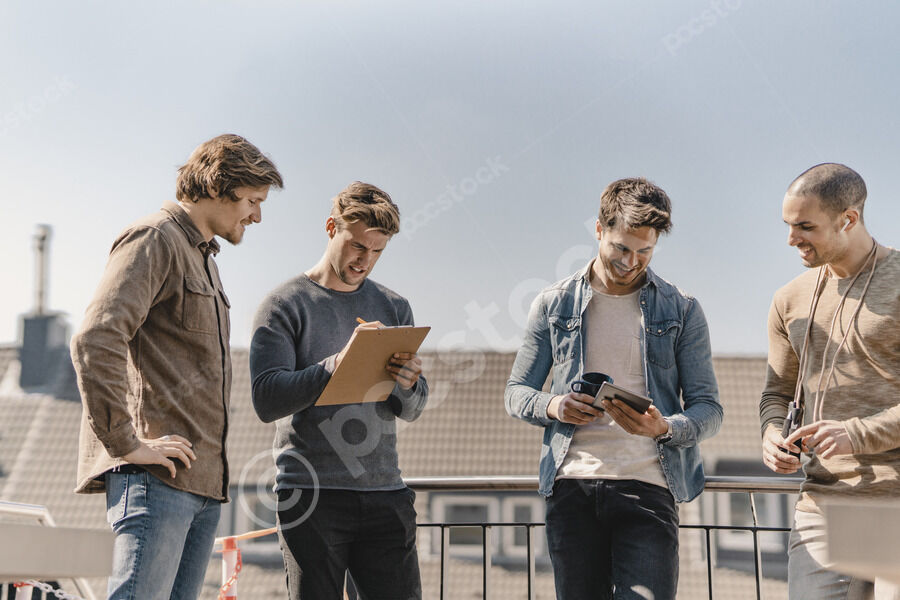 Middle Eastern man having meeting with caucasian male friends while standing together near fence on roof terrace on sunny day