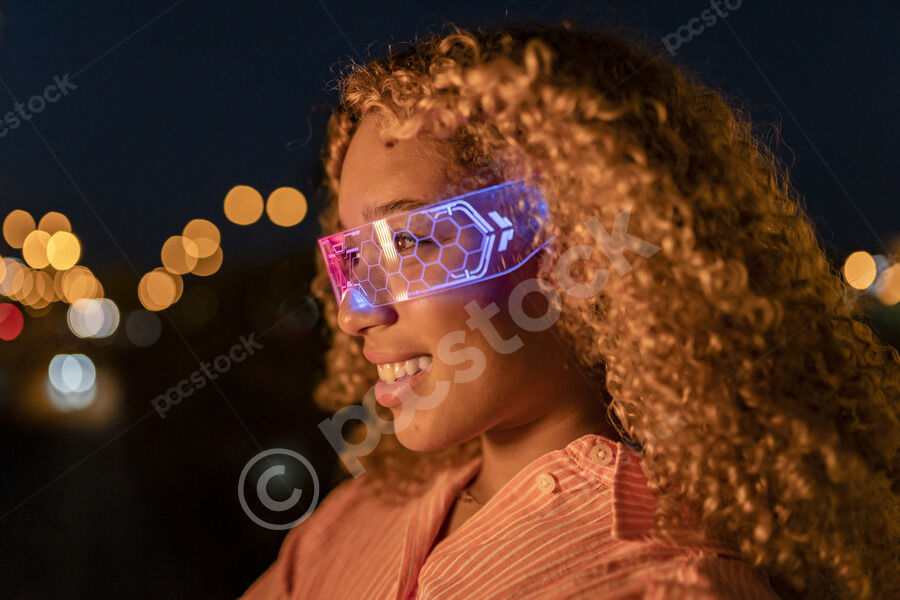 Hispanic woman with curly hair taking selfie while standing against metallic wall outdoors