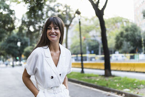 Hispanic woman with curly hair riding on skateboard near bollard on road during daytime