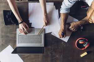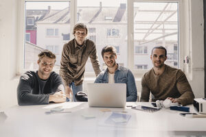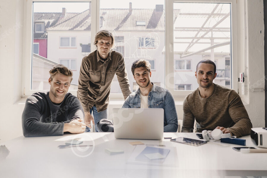 Diverse group of businessmen with laptop on table sitting and standing near glass window in office