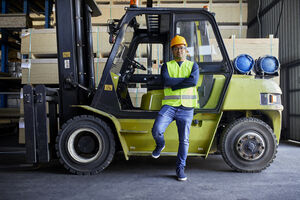 Asian male worker with eyeglasses leaning on forklift wearing safety vest and hard hat while standing with crossed arms in warehouse