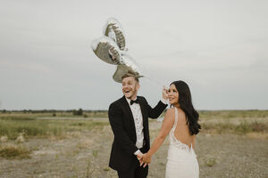 Asian bride and caucasian groom with heart-shaped balloons looking away while holding hands and standing together in field during daytime